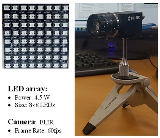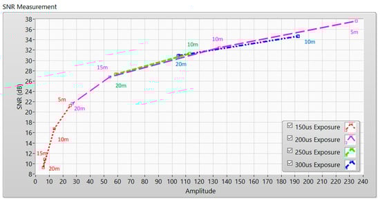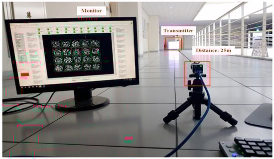 The SNR parameters were calculated and measured to analyze the relationship among range, power of transmitter, and exposure time. Through adjusting exposure time, we can improve the distance and SNR of a signal. In the experimental setup, multiple measurements were conducted at varying communication distances, ranging from 5 to 20 m. As shown in Figure 2, the transmitter side contained an 8 × 8 LED matrix, while the receiver side included a rolling shutter camera (Point Grey camera). Moreover, during the measurements, the camera’s exposure time was varied between 150 μs and 300 μs to evaluate its impact on communication performance at different distances (5, 10, 15, and 20 m).