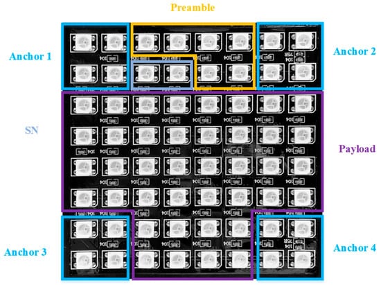 Because Region of Interest (RoI) algorithms [,] solve complex problems with high accuracy, they are frequently employed for object detection in OCC systems. Object-based and feature-based detection are the two principal methods that these algorithms usually employ [,]. The feature-based technique finds likely pixels and groups them to create a return on investment. However, as not every pixel in optical images has strong distinguishing characteristics, this method’s inability to reliably recognize a complete object is a disadvantage. On the other hand, by utilizing structural and shape-based information, the object-based approach provides enhanced RoI detection. Using an RoI technique, we locate anchors at the LED array’s four corners in this study. The receiver can effectively detect these four outermost LEDs using the RoI method because they are always in the ON state. The locations of the other LEDs in the array may be quickly ascertained and decoded if the coordinates of these four reference points are known.