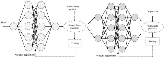 Figure 4 illustrates the frame structure of the 2D MIMO-OOK system. The four outermost corners of the LED matrix serve as anchor points for corner recognition. Using their coordinates, the positions of all LEDs in the array can be determined through perspective transformation. In this system, an 8 × 8 LED array is applied, with 40 LEDs allocated for information communication. As illustrated in Figure 4, the four corner LEDs act as anchors, with anchor 3 specifically enhancing rotational robustness at the receiver. Anchor 4 was the special anchor for the support rotation effect. With anchors 1–3, we used only a single LED with ON status, and three LEDs with OFF status. However, with anchor 4, we used four LEDs with ON status. The special corner is for the support rotation effect. Moreover, 16 LEDs at the anchor positions function as training signals, enabling the camera to distinguish between the ON and OFF states. Each frame includes a preamble to help the receiver identify the frame’s starting point. To accommodate variations in frame rate, the SN is incorporated in each packet. This SN helps synchronize the packet transmission rate with the camera’s frame capture rate, and its length is adjusted accordingly based on this relationship. After identifying the objects, the OCC signal was designated after the LED region using down-sampling. The 2D MIMO-OOK data was then distinguished by extracting the central intensity of each LED by YOLOv11 [,,,]. A dataset of 10,000 samples, including both preamble and payload segments, was collected using global shutter and rolling shutter cameras at varying distances (ranging from 1 to 20 m) and speeds. To prevent overfitting, we applied a simple deep learning neural network as revealed in Figure 5. The accuracy of this model achieved more than 95%. Once the preamble was detected, we were able to accurately decode the 2D-MIMO signals, enhancing the performance of the OCC system in mobile scenarios compared to traditional methods. It was observed that using six or more hidden layers could lead to overfitting, reducing the accuracy on test data. In addition, we applied a deep learning model for decoding data. By applying DL for detecting the preamble position and threshold value between bits “0” and “1” as shown in Figure 5, we improved OCC performance. For deep learning based on the decoder, we used a basic deep learning neural network model with two hidden layers to avoid overfitting the model. To reduce the interference between two LEDs in the LED array, the distance between two LEDs and the communication distance was considered. Due to the camera process based on the pixel in the image, to clarify multiple LEDs in the array, the distance between each LED needed to be higher than one pixel in the image.