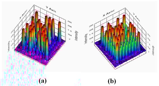Quantized intensity profiles of an 8 × 8 LED array with different exposure times and distances: (a) 1 m and 200 µs; (b) 2 m and 400 µs.