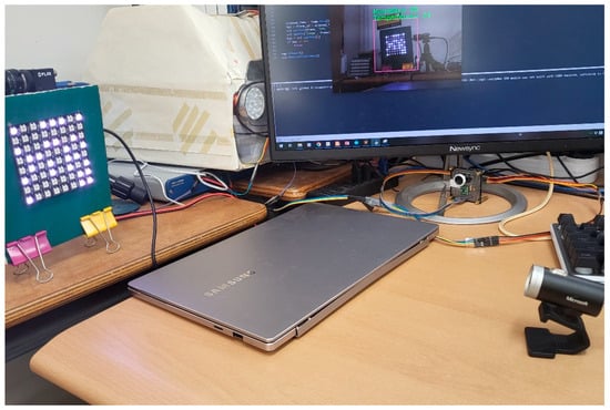 In this study, we conducted multiple deployments of the proposed scheme using a variety of cameras—including webcams, CCTVs, tablets, and a Point Grey camera—to evaluate the impact of frame rate variations. The asynchronous system involves components such as asynchronous decoding, data merging techniques, and missing data detection. The length of the SN is defined based on the overall integration of the system’s operations. Figure 6 displays the quantized intensity profiles of the images across different distances and viewing angles. Figure 7 depicts the experimental setup used to validate the 2D MIMO-OOK system, and Figure 8 presents the results obtained using 20 links. By using a focal length of 35 mm, we achieved 20 links at a 25 m distance with a data rate up to 15 kbps. Focal length refers to the distance between a lens and its focal point, where light rays converge or diverge. It is a fundamental property of lenses that determines both magnification and the angle of view in optical systems, such as cameras and the human eye. To increase the communication distance, we used a higher focal length. The implementation outcomes are provided in Table 1. A deep learning decoder was applied to improve OCC performance. For applications in a mobile environment, YOLOv11 was applied to detect the LED matrix. After receiving data, the camera distinguished the preamble and threshold prediction based on the deep learning model. In this study, we proposed deep learning for a 2D MIMO-OOK for long-range and mobile situations.