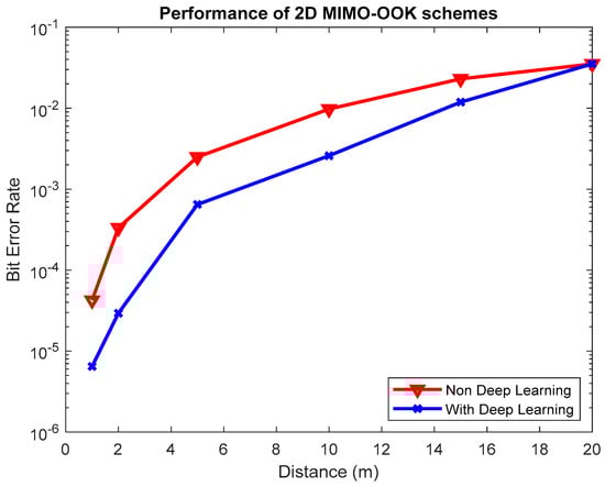 Bit error rate of proposed scheme for 8 × 8 LED matrix with deep learning and non-deep learning.