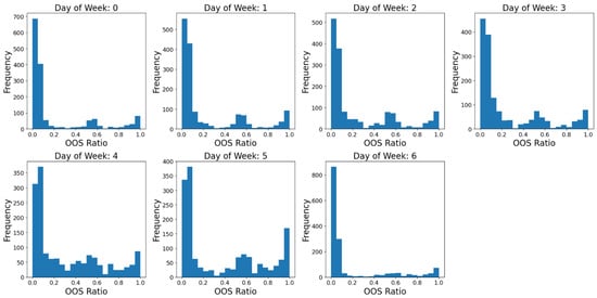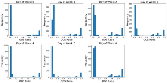 I use a dataset from Kaggle, a data science competition platform and online community for data scientists and machine learning practitioners. It is derived from a competition to predict store sales at Rossmann, which operates over 3000 drugstores in seven European countries. The dataset comprises the daily sales of each location over more than two years. Although the sales data in this dataset are aggregated across various drug products, for simplicity, I regard each store as selling only a single drug product. (Originally, the task of this competition was to predict 6 weeks of daily sales for 1115 stores located across Germany. The purpose of this paper is not to make predictions. I simply use the dataset to obtain an approximation of real-world retail sales data. The link to the Kaggle page is https://www.kaggle.com/competitions/rossmann-store-sales/overview. accessed on 12 June 2025) Figure 4 shows that, with this realistic sales data, the OOS distribution of each day of the week is still zero-inflated.