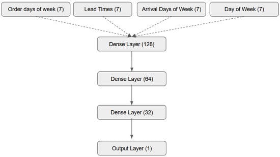 The third input to consider is the vector representing the days of the week when intake occurs, i.e., the day on which orders arrive at the store, based on the lead time from the order date. For example, if the store places an order on Monday with a 2-day lead time, the arrival day will be Wednesday. The arrival day is also represented as a one-hot encoded vector similar to the order day. This input is essential because it helps the model understand the timing of when the inventory is restocked, which directly impacts the availability of stock and the likelihood of running out of stock.