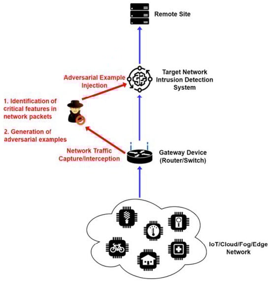 We assume a white-box attack model for the adversarial example detection method implemented in this paper; hence, the attacker is assumed to be cognizant of all the characteristics of the deep learning model implemented in the target NIDS, such as the model architecture, hyperparameters, and type of network traffic entering the NIDS. The attacker first captures the network traffic flowing through the gateway device, such as the router or switch, to generate adversarial examples. In general, NIDS are implemented at gateway devices, since they act as entry points into a network. The captured network traffic is analyzed to determine the critical features in the network packets. In the network intrusion detection context, the critical features are those which can cause the implemented deep learning model to misclassify incoming network traffic with minimal perturbation. In this study, adversarial examples are generated after the training phase and used exclusively during evaluation to test the detection capability of our proposed method. These examples are not included in the training dataset and do not influence model learning, maintaining the unsupervised nature of our detection strategy. In the next step, the attacker generates adversarial examples using an algorithm and injects the generated examples into the target NIDS. The attacker can choose to either perform a DoS attack, causing benign packets to be classified as malicious, or an evasion attack, causing malicious packets to be classified as benign. Figure 2 shows the attack model used for generating adversarial examples in the network intrusion detection context. As shown in Figure 2, traffic data are collected through a router and transmitted to a remote site. In this system, traffic is labeled as malicious after an attack is identified; Table 1 summarizes the approach adversarial example generation implemented in this work.
