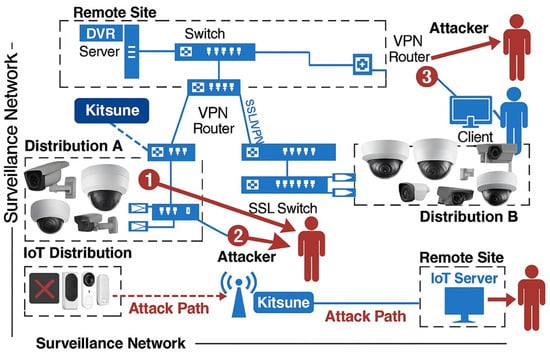 Our proposed method was evaluated on one of the Kitsune datasets. These datasets contain statistical features of network traffic traversing deployed IoT networks in successive time windows. A total of nine datasets constitute the Kitsune datasets, in which the network attacks can be categorized as reconnaissance, denial-of-service, man-in-the-middle attack, and botnet malware []. In preprocessing, we first normalized the selected dataset. We used one of the Kitsune datasets obtained for our evaluation of a man-in-the-middle (MitM) attack, as in Table 1. The Kitsune datasets can be adapted for use in machine learning applications. To enhance early detection of adversarial attacks, we developed a generalized model capable of identifying adversarial examples early in the training process. This approach improves the system’s security and reliability. The MitM attack was performed in an IP camera video surveillance network, with the attacker intercepting all LAN traffic through an ARP poisoning attack. Figure 3 provides the network topology from which the Kitsune dataset were obtained. In Figure 3, the labels 1, 2, 3, and X represent the locations where the attacker launches the attacks, and the label Kitsune represents the points from which network traffic was captured. The MitM attack in the current dataset affects the confidentiality of the network.