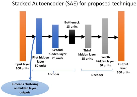 A stacked autoencoder (SAE) architecture with k-means clustering applied to the output of hidden layer.