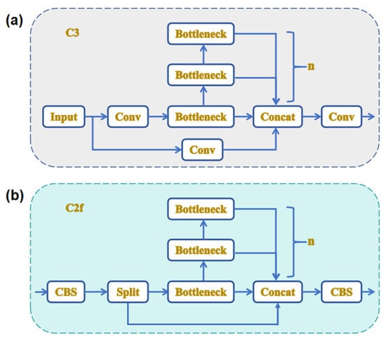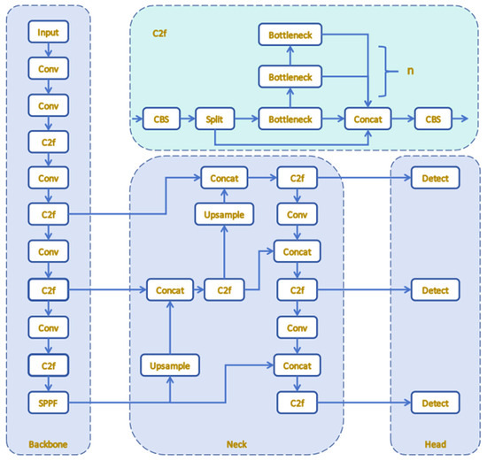 YOLOv8 replaces the convolutional 3-layer (C3) module in the backbone and neck with the csplayer_2conv (C2f) module [33,34]. This module adopts a lightweight design and increases gradient flow by introducing more skip connections and additional split operations, thereby improving convergence speed and effect. The C2f module uses two convolution block shuffle (CBS) components and N bottleneck flows. A CBS consists of a 2D convolution layer, a batch normalization layer, and an SiLU activation function. This design allows for multi-dimensional gradient flow while keeping the model lightweight. Figure 2 shows the structure of the C2f module, where N is the number of bottleneck modules. YOLOv8 has a basic 22-layer structure, including seven CBS convolutional layers and eight C2f convolutional layers, effectively balancing model complexity and feature extraction capability.