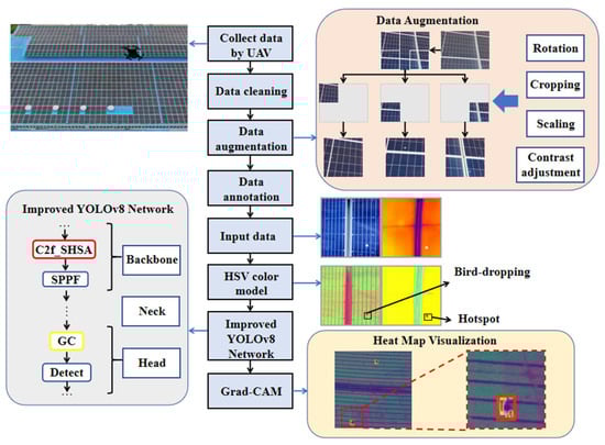 By incorporating a SHSA module and a GC module, our method improved the YOLOv8 target detection model, achieving precise localization and detection of bird droppings and hotspot faults while reducing computational and memory resource consumption. In data collection, a UAV was used to collect RGB and infrared images of rural photovoltaic panels, and a photovoltaic module fault image dataset dedicated to detecting bird-dropping contamination and hotspot defects was constructed. Meanwhile, the HSV color model was utilized to enhance the color difference in fault areas, improving the accuracy of feature extraction. The specific research process is shown in Figure 3.