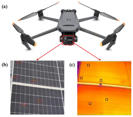 As illustrated in Figure 4a, the infrared and wide-angle cameras are integrated into a UAV [42]. By acquiring two images simultaneously, the different defects can be detected jointly. Since the accumulation of bird droppings can also cause hotspot defects, there is a spatial correspondence between the two in some images as shown in Figure 4b,c.