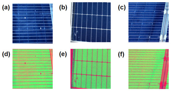 In the RGB color space, color values are represented as , where , , and denote the red, green, and blue channel intensities of a pixel, each ranging from 0 to 255. and refer to the maximum and minimum values among the three channels, respectively. After conversion to the HSV color space, the pixel is represented as , where indicates brightness (value), represents saturation, and is the hue angle, calculated piecewise based on the dominant channel. Figure 5 intuitively displays the comparison of photovoltaic images before and after conversion.