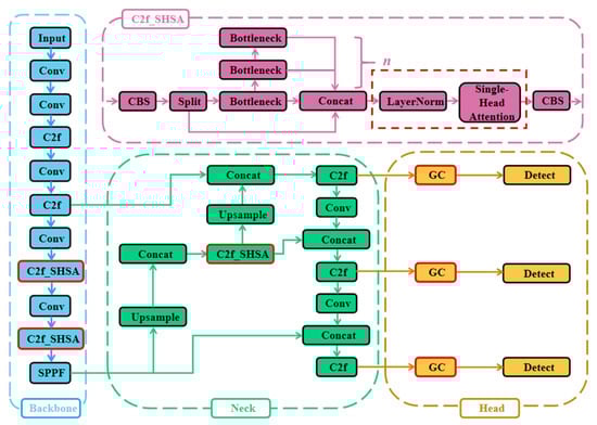 In photovoltaic fault detection, YOLOv8 exhibits several limitations, including inadequate adaptability to diverse fault types, suboptimal generalization performance, and insufficient feature extraction. To overcome these challenges, this paper proposes an enhanced YOLOv8 algorithm with integrated GC [45] and SHSA [46] modules, named YOLOv8-SHSA-GC (YOLOv8-SG). These architectural enhancements enable YOLOv8-SG to maintain computational efficiency while achieving substantial improvements in detection accuracy and generalization performance, particularly in the precise identification of bird droppings and hotspot faults. The comprehensive architecture of YOLOv8-SG is illustrated in Figure 7.