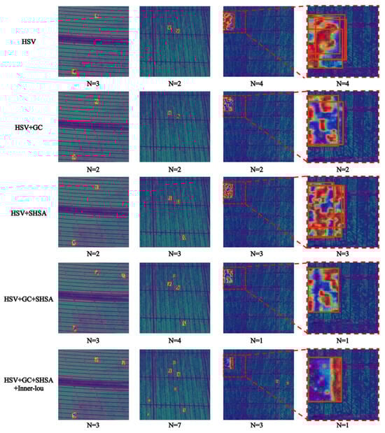 The heat maps in Figure 11 clearly demonstrate how the feature extraction capability gradually improves with the increasing complexity of the model. The initial model, using only the HSV color space, had a relatively basic feature extraction capability. However, with the introduction of GC and SHSA modules, the model’s ability to identify fault areas was significantly enhanced. The integration of these modules not only improved detection accuracy, but also optimized resource utilization, reducing the omission and misclassification of faults. This finding confirms the results of our previous ablation study, which showed that integrating different modules can significantly enhance the model’s computational power and feature extraction capabilities.