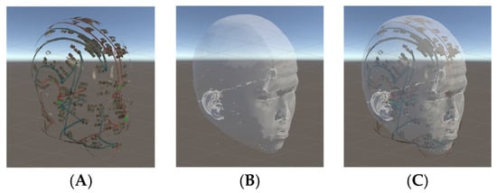 Regarding the model construction approach, we use a landmark-based scanning method to generate a personalized 3D head model. In contrast, Chang and Zhu [] relied on facial image datasets for feature-point extraction, which lacked real anatomical testing. Chan et al. [] implemented a CNN and inch-based mesh estimation on robotic arms for upper-limb points, while Chiou and He [] proposed a Vuforia-based AR system for face localization, but tested only on a mannequin head.
