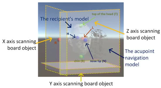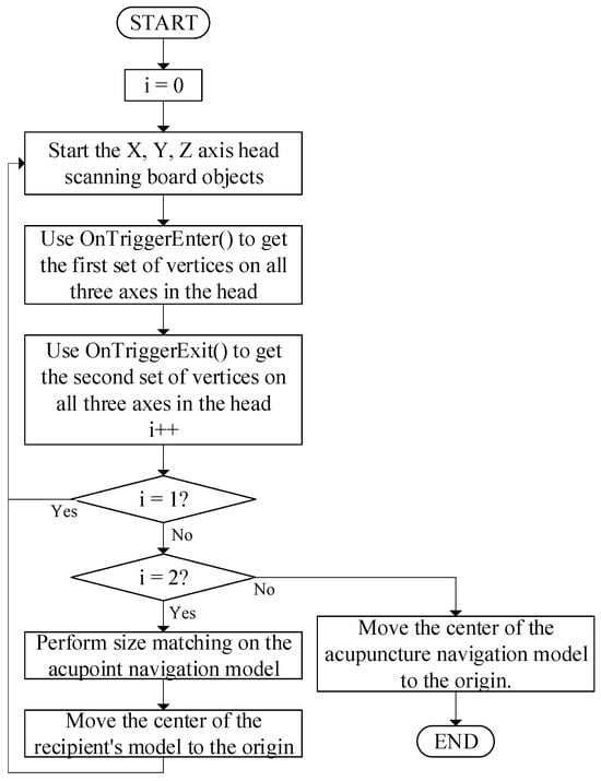 The process performs three structured scan iterations. Each scan uses the same trigger-based mechanism to obtain head axis coordinates. The first scan enables scaling of the acupoint navigation model; the second scan aligns the recipient’s head model to the origin; and the third aligns the acupuncture navigation model. This logic is represented in the revised flowchart (Figure 3).