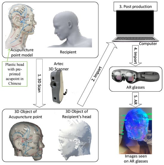Step 1: A 3D scanner (Artec Eva, Artec 3D, Senningerberg, Luxembourg) is used to scan the recipient’s head, which is then processed into a 3D object model. This model is imported into a Unity project, where manual adjustments are made to the phase. The Unity project already contains the acupuncture point navigation model, which was obtained from Chiyuan Bookstore, a specialized retailer for traditional Chinese medicine books and acupuncture equipment. This model has been post-processed to accurately represent the acupuncture points.