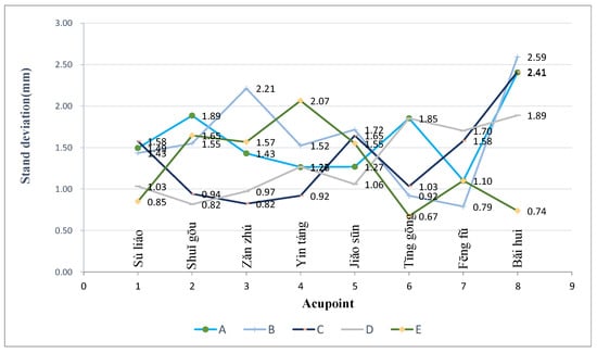 This subsection primarily analyzes the accuracy of this study’s experiment. First, the variability in acupuncture point locations, as reported in Traditional Chinese Medicine studies, is reviewed. Molsberger et al. [] suggested that acupuncture points are not fixed but instead represent areas. In randomized controlled experiments, they recommended a 2-cun (approximately 5 cm) difference between acupuncture points to observe distinct effects, indicating some variability in their placement. Their data also showed that different acupuncturists had a distribution of 11.27 square centimeters when locating GB14 [].