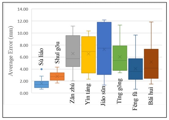 Returning to this study’s results, we note that in Figure 9, the average error for the eight acupuncture points across the four facial orientations was less than 8 mm. This is significantly smaller than the 2-cun range mentioned in the literature, confirming the accuracy of the 3D scanning and positioning method. Points near detailed facial structures like Sù liáo and Shuǐ gōu had lower errors, possibly due to more distinct anatomical features aiding alignment. In contrast, points like Jiǎo sūn, near the ear, showed higher variability, likely due to differences in ear size and position among recipients.