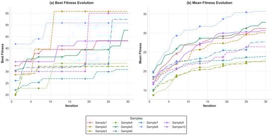 Specifically, during the hyperparameter optimization of the 10 samples, as shown in Figure 5, the best fitness of each sample during the IABC iteration was steadily increased from an initial mean value of 28.62 to a final mean value of 45.23 at the end of the iteration, which indicates that the average increase in the best fitness of all the samples reached about 58.0%. At the same time, the average fitness of the entire population also increased from about 17.03 at the beginning to about 29.28 at the end, which represents an average increase of about 71.9%. These results initially show the effectiveness of the IABC algorithm in searching for more optimal hyperparameter combinations. It is worth noting that the exact value and percentage of improvement of the fitness depend on the definition of the fitness function, but its growth trend reflects the convergence ability of the optimization algorithm. Moreover, there are significant differences in the optimization effects of different samples, which reflect the necessity of the personalized optimization and the adaptive nature of the IABC algorithm. These data optimization effects fully demonstrate the excellent search performance of IABC algorithm in complex hyperparameter space. The IABC optimization process is shown in Figure 5. The horizontal axis is the number of iterations (1–30), the vertical axis of Figure (a) is the average best fitness of 10 samples, and the vertical axis of Figure (b) is the average population fitness. The curves show the overall convergence trend and optimization effect of the IABC algorithm, reflecting the search efficiency and stability of the algorithm in the iteration process.