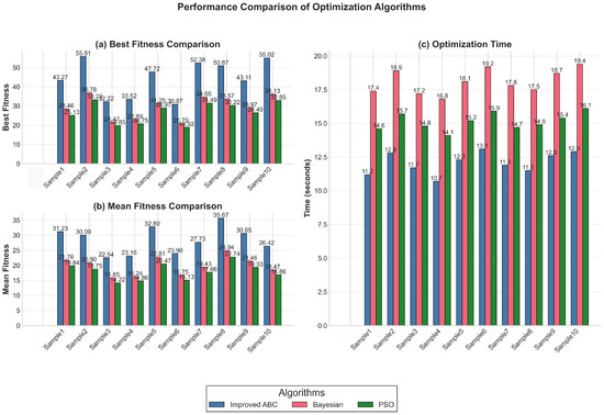 To validate the performance of IABC, comparative experiments were conducted with Bayesian optimization and particle swarm optimization (PSO) algorithms on identical optimization tasks. The experimental results across 10 samples runs demonstrate that IABC consistently outperformed both baseline methods. Specifically, IABC achieved a mean best fitness of 44.48 (±9.50), significantly higher than Bayesian optimization (29.50 ± 6.04) and PSO (26.79 ± 5.44). Moreover, IABC exhibited superior computational efficiency with a mean optimization time of 12.07 s (±0.80), compared to 18.10 s (±0.90) for Bayesian optimization and 15.14 s (±0.63) for PSO. These results empirically confirm the theoretical advantages of IABC in handling complex hyperparameter optimization tasks for deep learning models. Figure 8 illustrates the performance comparison between IABC, Bayesian optimization, and PSO across 10 independent runs. And, as described in Section 2.2, IABC is theoretically able to handle the complex hyperparameter space of deep learning models more efficiently than standard ABC by introducing mechanisms such as parameter type-aware search strategies, structural constraints handling, and log-space search for learning rate.