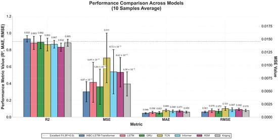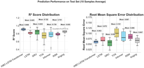 The results show that the proposed hybrid modeling framework outperforms in all performance metrics: the mean value of R2 is 0.932 ± 0.038, which is 5.5% better than LSTM (0.883 ± 0.079), 4.5% better than GRU (0.892 ± 0.077), 8.0% better than TCN (0.863 ± 0.077), 7.5% better than Informer (0.867 ± 0.047), 12.0% better than RSM (0.832 ± 0.050), and 5.3% better than Kriging (0.885 ± 0.041); the mean MSE value of 0.00487 ± 0.00196 is 27.2% lower than LSTM (0.00669 ± 0.00386), 16.6% lower than GRU (0.00584 ± 0.00339), 57.2% lower than TCN (0.01137 ± 0.00479), 44.1% lower than Informer (0.00872 ± 0.00427), 43.5% lower than RSM (0.00862 ± 0.00283), and 23.7% lower than Kriging (0.00638 ± 0.00232). In terms of error control, MAE (0.0464 ± 0.0077) and RMSE (0.0612 ± 0.0101) are reduced by 8.9% and 13.0%, respectively, compared to the optimal benchmark model GRU, and the standard deviation is narrowed down by 46–57%, which shows that the more stable prediction ability is significantly improved compared to all other benchmark models. Figure 9 demonstrates the average performance and standard deviation of each model on the test set, and Figure 10 presents the comparison of the distribution of the predictive performance metrics of each model on the 10-sample test set in the form of box-and-line diagrams, intuitively reflecting the stability and superiority of the proposed model.