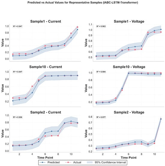 The predicted values of the IABC-LSTM-Transformer model on each sample are highly compatible with the true values, especially in capturing the degradation trend. In order to visualize the model’s fitting effect at the learning level, the normalized data is used here as an example. Taking Sample 10 as an example, at the 11th time point of its test set sequence (which represents an observation point in the late stage of accelerated aging), the true value of the normalized current is 0.8993, and the predicted value of IABC-LSTM-Transformer is 0.9012, with a relative error of only 0.21%; the true value of normalized voltage at the same time point is 0.9916, and the predicted value is 0.9625. The predicted value is 0.9625 with a relative error of 2.93%. These low errors on the normalized scale indicate the model’s ability to accurately predict both current and voltage for the later degradation behavior, showing high prediction accuracy. All 10 samples consistently show high accuracy on the normalized data, and their prediction curves accurately reflect the nonlinear change trend, which lays a good foundation for the subsequent inverse normalization to the original unit for lifetime extrapolation.