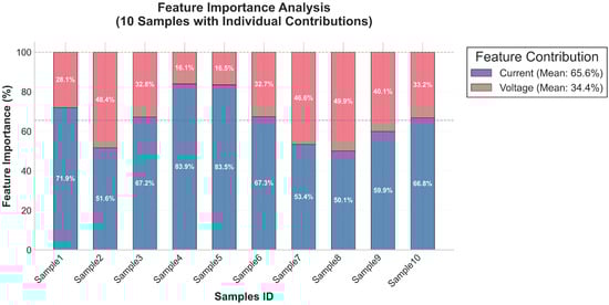 Figure 13 illustrates the average importance weights (in percent) of the current and voltage features over the 10 samples, with the sample number on the horizontal axis and the percent importance on the vertical axis.