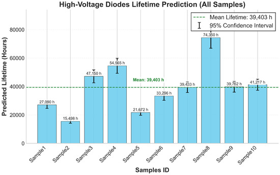 Lifetime prediction is performed using a threshold crossing and hybrid extrapolation-based approach. Specifically, the degradation trend of the high-voltage diode is first predicted based on the IABC-LSTM-Transformer hybrid modeling framework, and 2.0 A and 15.0 V are adopted as the failure thresholds for the maximum reverse current and the highest forward voltage, respectively. During the prediction process, it is prioritized to check whether the degradation parameter crosses the threshold within the prediction horizon; if it does, the time corresponding to the first sustained crossing point (at least three out of five consecutive points above the threshold) is taken as the predicted lifetime, and the failure mode is determined based on the parameter that reaches the threshold first. If the predicted sequence does not cross the threshold in the field of view, a hybrid slope extrapolation method is used: the robust degradation rate of the historical data and the slope at the end of the model prediction are combined to calculate the integrated degradation rate and the predicted lifetime is obtained by extrapolating to the threshold accordingly. To assess the uncertainty of the prediction, a 95% confidence interval (CI) was constructed. The final prediction results showed that the average predicted lifetime of the 10 samples was 39,403.3 h (standard deviation 16,961.8 h), the mean value of the relative uncertainty of prediction was 12.57%, and the main failure modes were all reverse current overruns. There are large differences in lifetime between samples, e.g., the predicted lifetime of Sample 12 is 15,498 h (CI:[14,152, 16,844]), while Sample 18 reaches 74,350 h (CI:[66,942, 81,757]), and this difference mainly stems from the different current degradation rates of the samples: for example, the high current degradation rate of Sample 12 (0.00614) may lead to its shorter lifetime, while the low degradation rate of Sample 18 (0.00106) is consistent with its longer lifetime. The distribution of lifetimes across samples is right skewed, with a median of approximately 39,762 h, as shown in Figure 13.