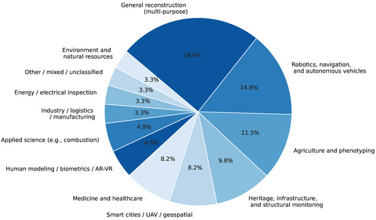 Figure 3 shows the frequency distribution of the application domain among the surveyed literature. The predominant category is general-purpose 3D reconstruction with 24.6% of the entries, reflecting the cross-domain and general applicability of reconstruction algorithms. Robotics, navigation, and autonomous vehicles are the second-largest domain, reflecting the importance of spatial knowledge in smart and mobile systems. Medicine, agriculture, and structural monitoring indicate the increased use of 3D reconstruction in high-impact areas such as healthcare, phenotyping, and infrastructure inspection. Additional areas with moderate representation are smart cities and geospatial analysis, and human modeling and AR/VR applications.