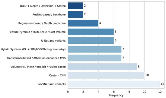 The most frequently used method is multi-view stereo integration with deep learning,. This compound method leverages the strength of traditional MVS pipelines and adds deep feature extraction or depth regularization modules to significantly improve reconstruction accuracy. The second most frequent are monocular depth estimation models based on a single RGB image, found in eight studies, and often used because they are convenient and usable in limited environments.