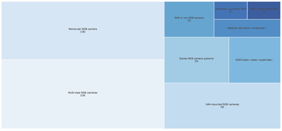Camera and sensor types in 3D reconstruction studies. Note: RGB-based sensors dominate the landscape, with limited representation from synthetic and non-visible spectrum modalities.