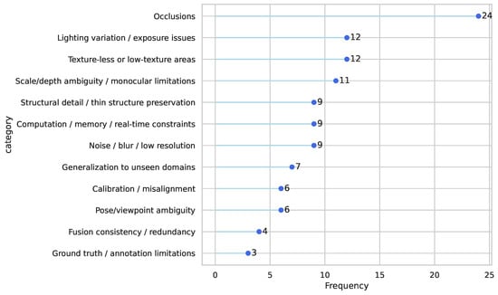 In the context of 3D reconstruction systems, numerous challenges hinder the development of accurate and efficient models. These challenges range from intrinsic issues in visual information, such as occlusions [24,28,50], textureless surfaces [71], and scale ambiguity [76], to technical issues, including computational demands [21,42] and real-time processing requirements [65]. Among these challenges are environmental ones, such as changing lighting [66,71], in addition to domain-specific issues like misalignment [83], annotation errors [22], and noise [84]. In addition, generalization to unknown domains remains a persistent challenge, especially for deployment beyond controlled laboratory settings [48,52]. These diverse challenges are not only reused across the literature, but are also key to defining the performance and usefulness of reconstruction techniques. Figure 6 illustrates these occurrences within recent work for each challenge, confirming the prominence of occlusions and low-texture scenes as major roadblocks to existing methods.