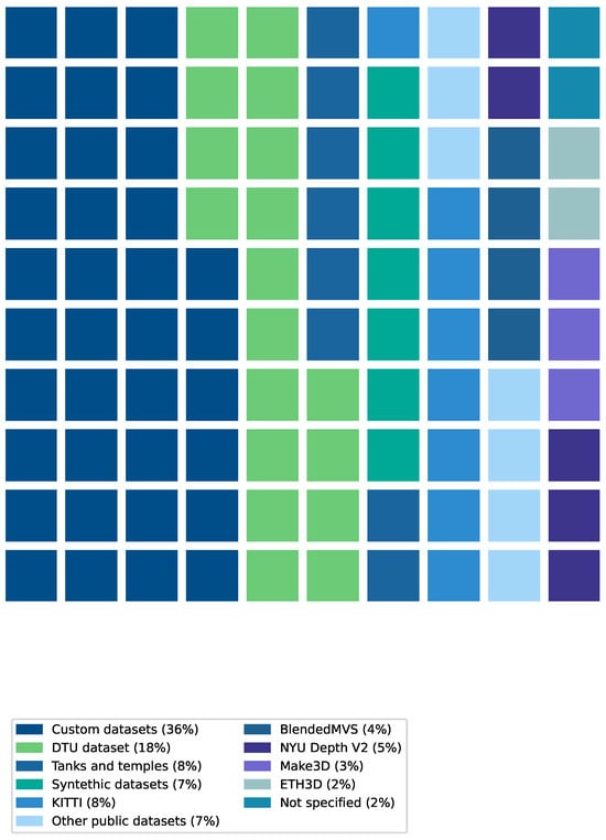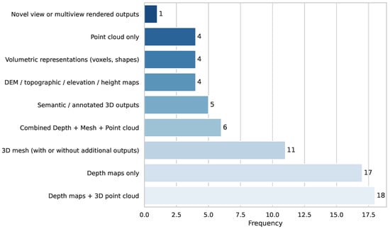The way in which the validity of the model is presented plays a critical role in assessing the effectiveness and applicability of 3D reconstruction techniques. Depending on the intended use case, such as visualization, navigation, simulation, or quantitative analysis, different types of output may be required. The most commonly reported results across the reviewed literature are depth maps, either standalone or in conjunction with 3D point clouds, reflecting a focus on efficient and scalable depth estimation methods. In addition to these, more comprehensive representations, such as 3D meshes, volumetric structures, or semantic 3D scenes, are also presented, particularly in applications involving simulation, robotics, or scene understanding. Less frequently, studies produce topographic elevation maps or novel view-synthesis outputs, which are typically tailored to specific domains such as remote sensing or augmented reality. Figure 7 presents the distribution of the output formats reported in the analyzed studies, highlighting the dominance of depth-based and point-cloud representations in current 3D reconstruction research.