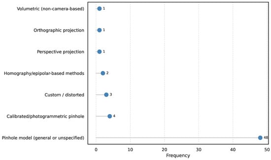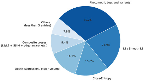 Loss functions play a crucial role in the training of deep learning models for 3D reconstruction by guiding the optimization of model predictions. Among the reviewed literature, photometric loss and its variants are the most widely adopted [34,52,85], as they directly penalize photometric discrepancies between projected and reference images. This is followed by standard L1/Smooth L1 losses [42,48,54], which are valued for their simplicity and robustness. Cross-entropy loss and depth regression losses, such as MSE or volumetric error metrics, are also frequently employed [22,26,51,72]. Composite approaches that integrate multiple components, such as SSIM, edge-aware terms, or perceptual constraints, appear in multiple studies, indicating an effort to balance multiple aspects of reconstruction quality [23,86]. Less common but still relevant are losses like Dice, Chamfer distance/surface consistency, perceptual/adversarial losses, uncertainty-aware techniques, and classical methods. For simplicity and clarity, these less frequent techniques are grouped under “Others” in the figure [25,28]. Figure 8 shows the distribution of loss functions reported in the selected 3D reconstruction studies.