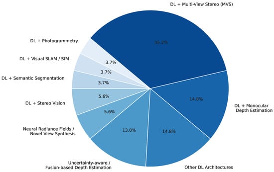 The other hybrid methods include the integration of photogrammetry pipelines with deep learning, and visual SLAM and structure-from-motion. Other work integrates semantic segmentation modules into the process of reconstruction itself. Fewer studies rely exclusively on conventional non-deep learning and are noted here for contrast. Figure 9 illustrates this information.