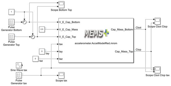 The accelerometer model imported into the MATLAB Simulink environment (Figure 5) has three acceleration inputs for each axis. It also has three electrical inputs to which we applied electrical signals. For VEcapTop and VEcapBottom, we applied the square wave, but with the phase reversed. For VEcapMass we applied 2.5 volts. This was necessary to obtain optimal input conditions for the operation of the accelerometer. At the outputs of the model we have two capacitances (Ctop and Cbottom). Their variation is proportional to the input signal.