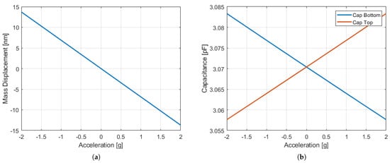 Simulation results for g acceleration in MEMS+ for the X-axis accelerometer: (a) seismic mass displacement. (b) Capacitance change (Cbottom—blue line and Ctop—red line).