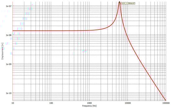 The next simulation was the modal analysis of the accelerometer. This was necessary to find the resonant frequency of the seismic mass of the sensor. The results of the simulations can be found in Table 1. From these results we may conclude that the correct operating range for the sensor is below the first resonant frequency, which is equal to kHz. The same information can be obtained from the AC analysis. The results of it are shown in Figure 7. We can see the resonance for the kHz frequency, which is very close to the modal analysis performed in MEMS+. This confirmed the limit of the operating range of the sensor to one kHz, which is below 6 kHz.
