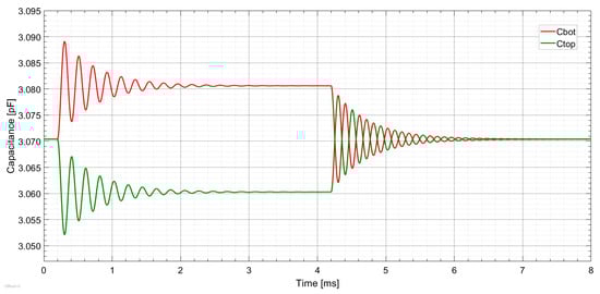 At equilibrium, where all accelerations are zero, the two capacitances are also equal, and their value is pF. If we force the acceleration in the x-axis direction from 0 to 1 g, we see that the capacitance changes are equal to pF and pF (Figure 8). This is only a change of 10 fF for each capacitance. Importantly, we observe an oscillation in the sensor response of almost 2 ms. After this time, outputs of the sensor settle into equilibrium. These oscillations are related to the lower pressure inside the sensor, which is 800 Pa, meaning that it is very sensitive. In a real sensor, we have small differences in the top and bottom capacitance in the equilibrium state, which have to be trimmed by the ASIC. Only in this way can the achieved optimal state of the sensor for 0 g acceleration be achieved.