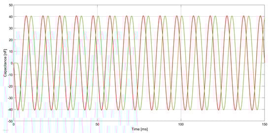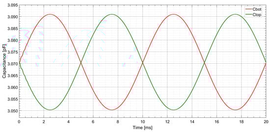 Simulation results of the X-axis accelerometer for sinusoidal acceleration equal to an amplitude of 2 g and a frequency of 100 Hz in MATLAB Simulink. Capacitance change (Cbottom—red line and Ctop—green line).