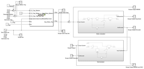 The accelerometer outputs changing capacitances Ctop and Cbot, corresponding to the top and bottom sensing electrodes. These capacitances change depending on the displacement of the proof mass due to the acceleration applied. These two signals are visualized separately and then subtracted to create a differential capacitance signal that is more sensitive to motion and less affected by noise or common-mode disturbances. This differential capacitance signal is then fed into a subsystem representing the sigma-delta ADC, which is shown in detail in Figure 14. Inside this ADC block the analog signal is processed through modulation, quantization, filtering, and decimation stages to produce a digital output. The model also includes a path that delays the analog signal to align it with the digital output, allowing accurate calculation of the error between the original and reconstructed signals. Several scope blocks are used throughout the model to monitor important signals such as the input acceleration, individual capacitance values, the differential signal, and both the analog and digital outputs of the ADC. The complete system demonstrates a realistic simulation of a MEMS accelerometer signal chain from physical excitation through capacitive sensing to digital conversion and error analysis.