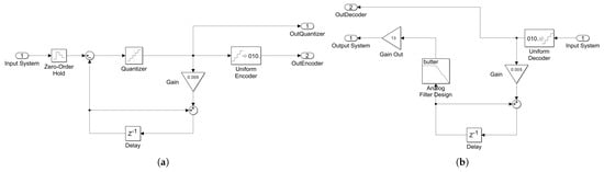 Accelerometer with the processing part model in MATLAB Simulink: (a) delta modulator; (b) delta demodulator.