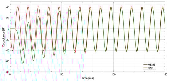 The next simulation results show the response of the sensor to a sinusoidal input signal representing external acceleration. The amplitude of the signal was equal to g, and the frequency is equal to 100 Hz. As can be seen in Figure 9, the response of the sensor is very good. The output capacitance changes along with a sine wave with an amplitude of 40 fFp-p. A total of V has been applied to the seismic mass pin to polarize this part of the structure and eliminate the possibility of oscillations in the sensor response.