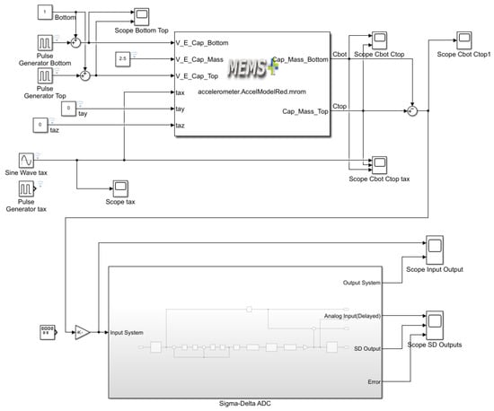 Figure 13 shows the top-level Simulink model of an accelerometer system with a sigma-delta analog-to-digital converter. At the center is a MEMS accelerometer model labeled accelerometer.AccelModelRed.mrom which simulates the behavior of a capacitive sensor using pre-defined reduced-order models. The model receives excitation signals in the form of voltages applied to the bottom, top, and central sensing electrodes. These voltages come from a combination of constant values and pulse generators, simulating dynamic conditions or electrical excitation. A sine wave input labeled tax is used to simulate acceleration along the X-axis, which serves as the primary mechanical stimulus for the sensing system.