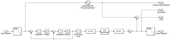 Sigma-delta analog-to-digital converter model in MATLAB Simulink.