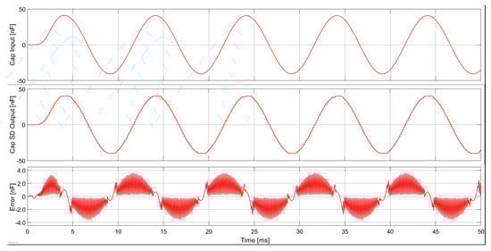 Simulation results of the capacitance change as an input signal (top), quantized output capacitance change (middle), and signal error (bottom).