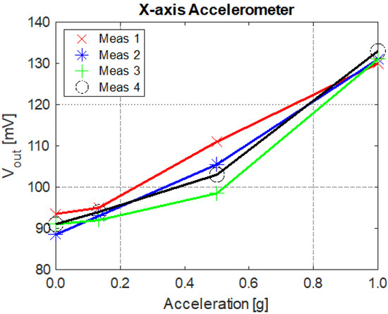 The measured output voltage of the external readout circuits with the MEMS accelerometer as a function of acceleration. The measured device was positioned at four angles (0, 30, 60, and 90 degrees). The same measurements were repeated four times [13].