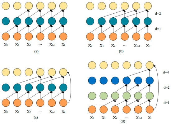 where S is the output result, f is a one-dimensional convolution kernel with a size of k, representing the convolution operation, d represents the dilation factor, and xtd·i represents the units covered in the mapping field. Figure 3 demonstrates how to adjust the receptive field size through dilated convolutions, where the convolution kernel size is 2, and the sampling interval is set to d = 1, 2.