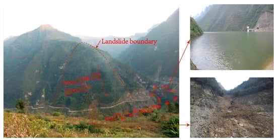 The Zhongliang Reservoir slope, situated on the right bank of the XiXi River in Zhonglian Township, Wuxi County, Chongqing, presents a fan-shaped topography with well-defined boundary conditions. This slope is located approximately 1.2 km from the Zhongliang Reservoir. The elevation at the base of the slope foot is 540 m, extending to a height of between 540 m and 1183 m at the slope’s crest. Spanning a width of about 700 m, the slope’s overall topography is notably steep, with the central region being particularly precipitous. Influenced by the area’s lithology and geological structure, the bank slope’s terrain predominantly comprises quaternary residual deposits and slope deposits. The comprehensive topography of the slope and its relative position to the reservoir are illustrated in Figure 4: