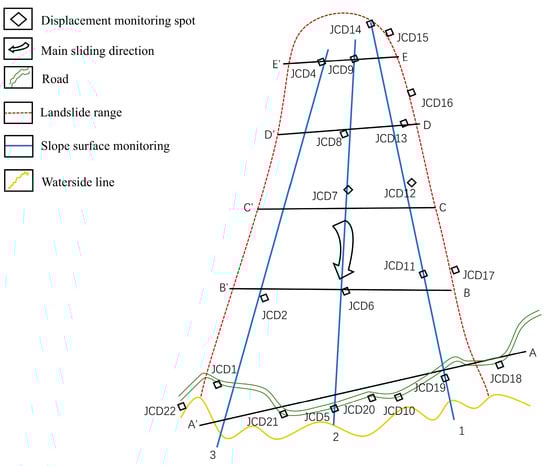The studied slope is equipped with a total of 22 monitoring points, each providing dynamic three-dimensional coordinates (x, y, z) over time. The initial step involved aggregating the data from these points, merging the three-dimensional coordinates of 2793 individual data points into 22 comprehensive sets representing spatial cumulative displacements. A comparative analysis of these cumulative displacements against the three-dimensional coordinates reveals that lateral displacement predominates, with other types of displacements being relatively minor. The specific locations of these 22 monitoring points are depicted in Figure 5.